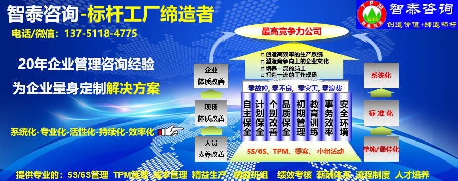 智泰咨詢下屬的5S管理公司首創(chuàng)的產品三天一標桿,三天一條線,三天締造6~8個標桿車間,智泰咨詢專業(yè)的顧問團隊為企業(yè)的5S管理快速打造已形成一套標準化內容。